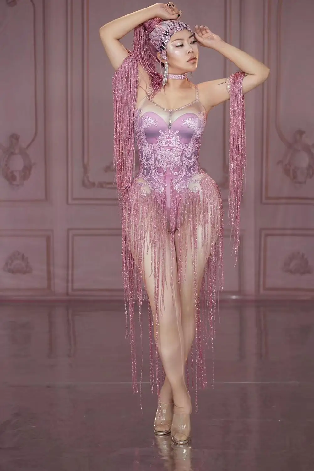 Addition Information of Bar Nightclub Female Singer Stage Wear Stretch Pink Rhinestones Tassels Bodysuit Party DJ Show Leotard Performance Costume